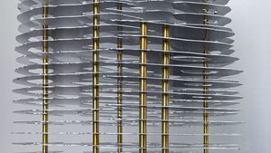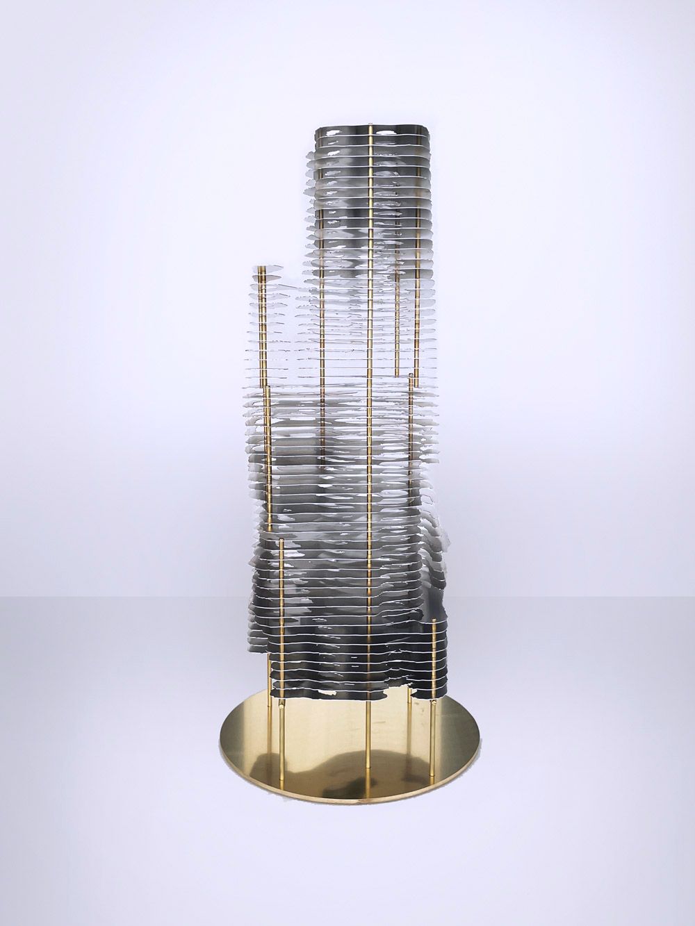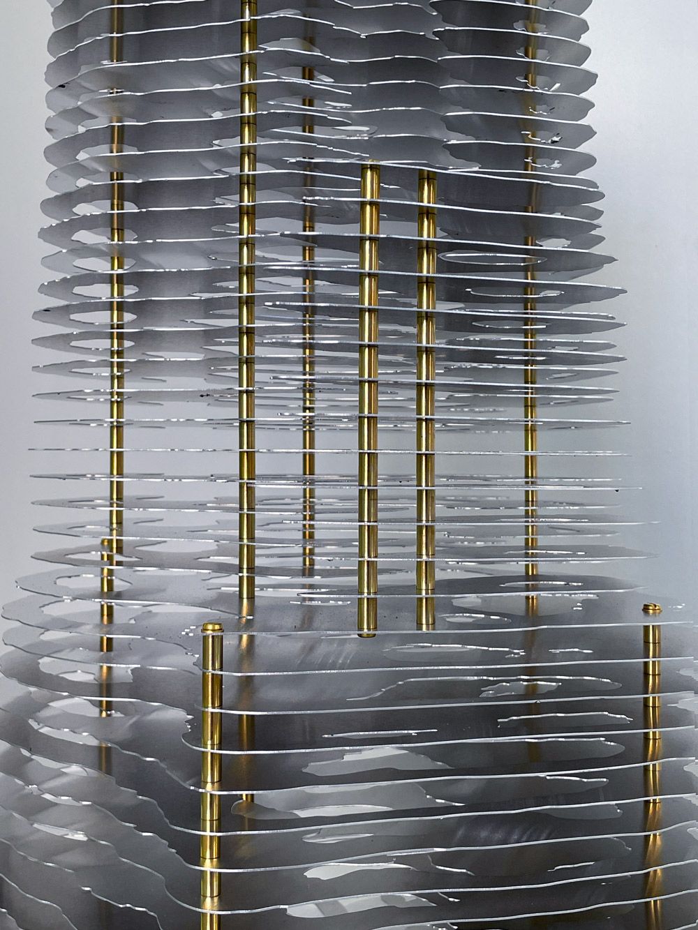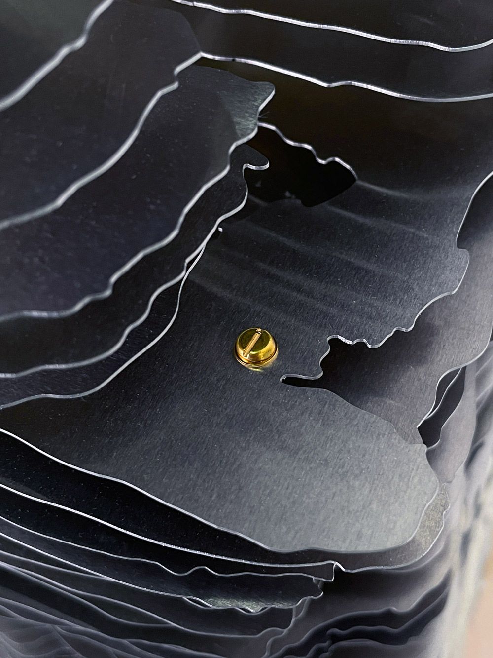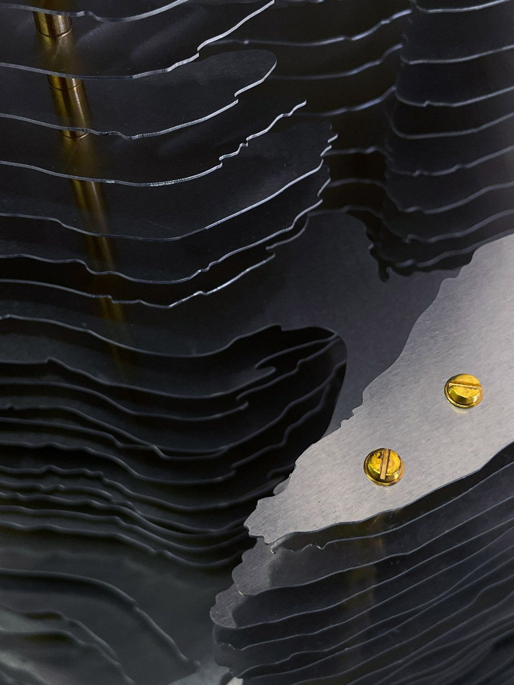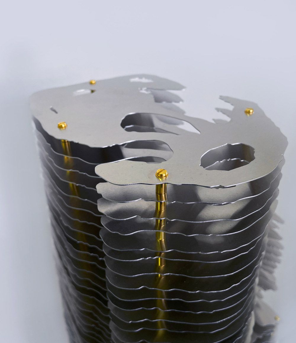 The superposition of metal strata is similar to that of a heatsink used to cool electronic components. The decomposition of the layers reveals in three dimensions the temporal and thermal evolution of a computational system's activity, making visible both the energy trace and the physical imprint of the process.